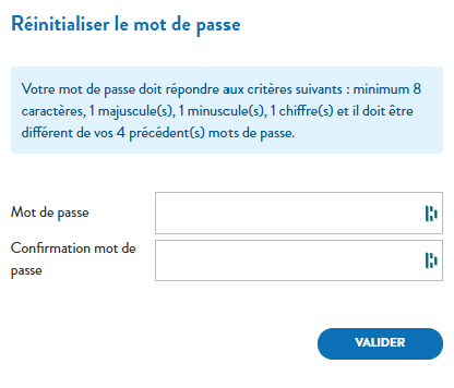 Dès la réception du mail de réinitialisation de mot de passe, cliquez sur le lien et saisissez votre mot de passe personnel en respectant les conditions minimales suivantes : 8 caractères, 1 majuscule 1 minuscule, 1 chiffre.